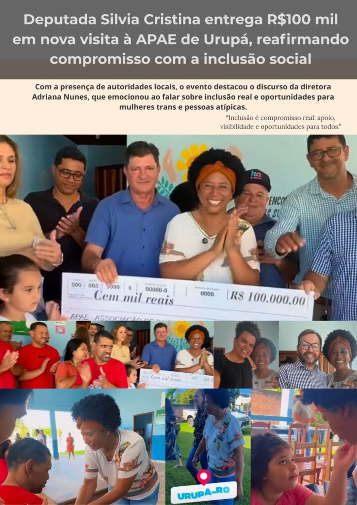 Na pequena cidade de Urupá, interior de Rondônia, um gesto simbólico reacendeu um importante debate nacional: o que realmente significa inclusão social? Durante a entrega de um cheque de R$ 100 mil à APAE local pela deputada federal Silvia Cristina, a protagonista da tarde não foi apenas a verba, mas o discurso firme, emocionado e aplaudido da atual diretora da instituição, Adriana Nunes.