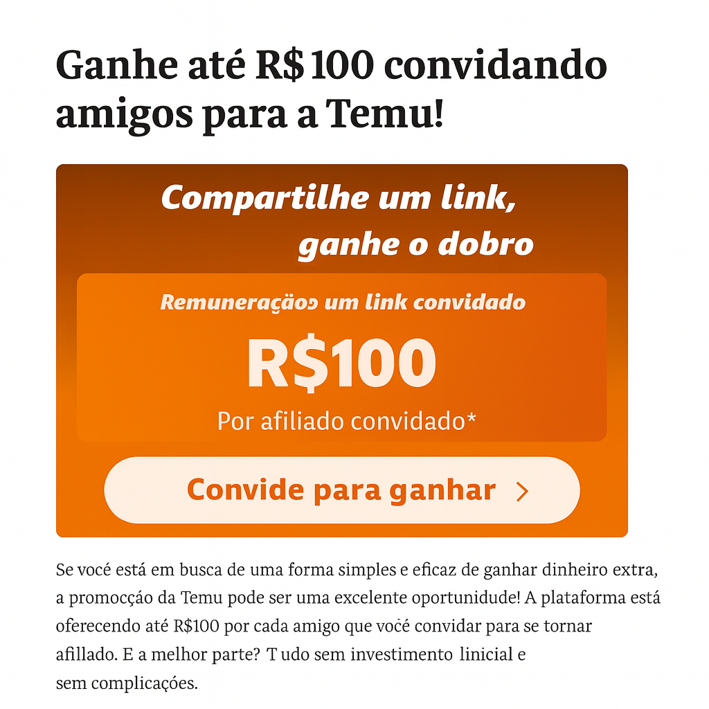 Se você está em busca de uma forma prática de ganhar dinheiro extra, sem precisar vender, investir ou sair de casa, essa é sua chance real. A Temu, plataforma global de compras e afiliados, está pagando até R$100 por pessoa que você convida para se tornar afiliada.
